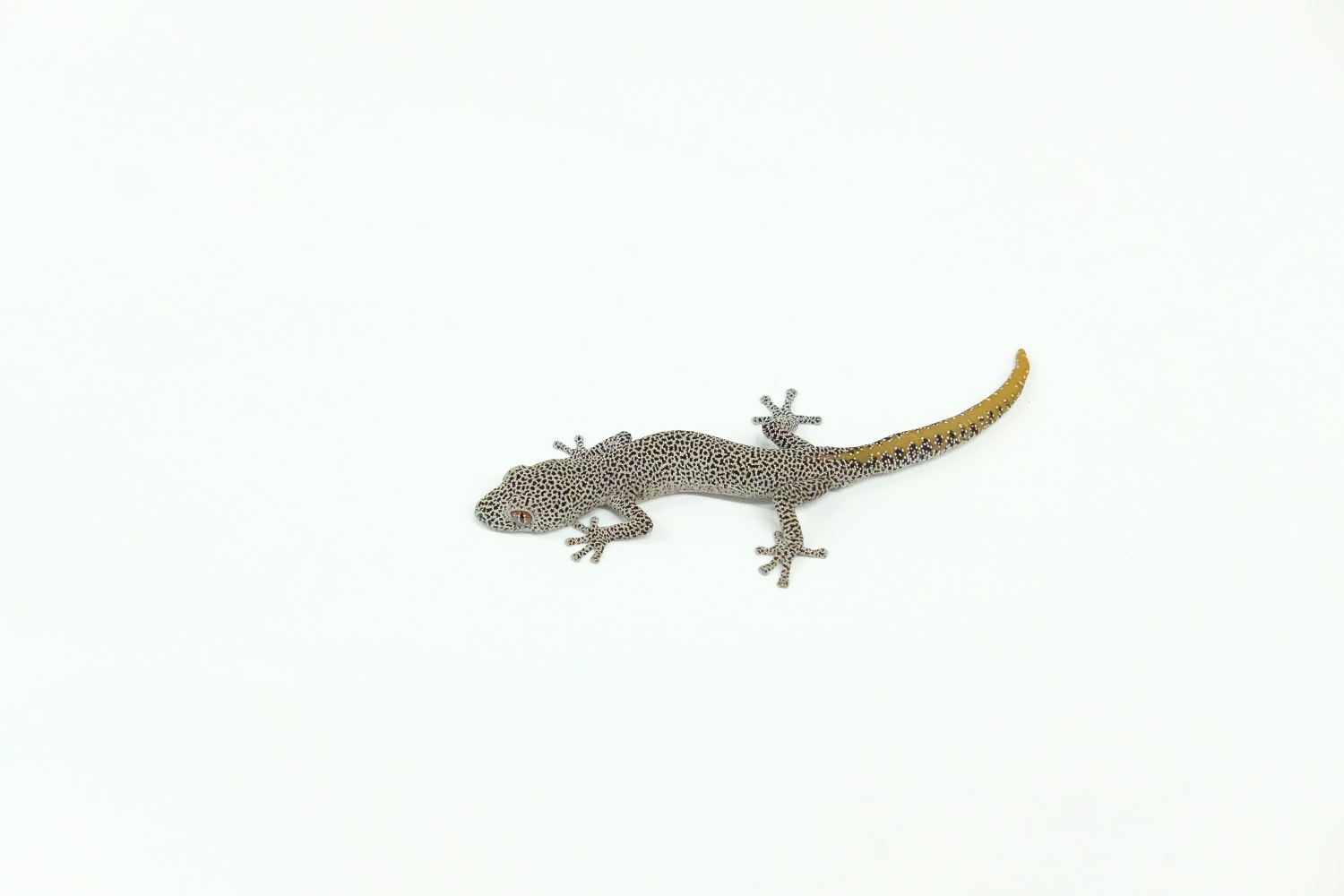 細かな模様が入る体にに黄色の尻尾、赤い目と観賞価値の高い樹上性のイシヤモリです。